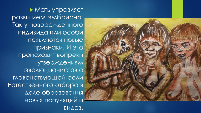 u Мать управляет развитием эмбриона. Так у новорожденного индивида или особи появляются новые признаки. И это происходит вопреки утверждениям эволюционистов о главенствующей роли Естественного отбора в деле образования новых популяций и видов.