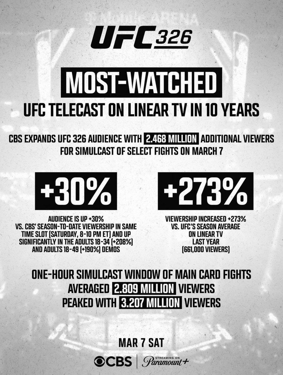 🔥 UFC 326 установил рекорд по просмотрам. В США пиковая аудитория трансляции достигла 3,2 млн зрителей.