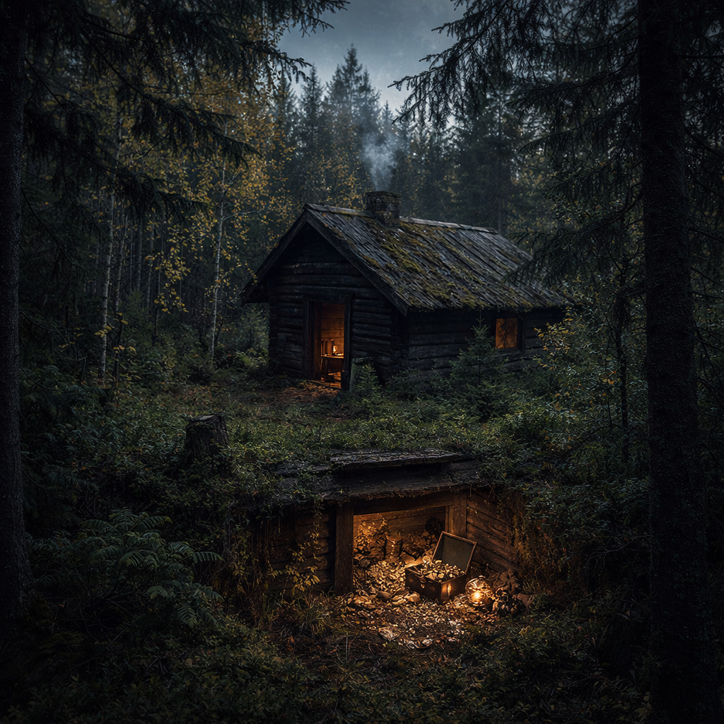 На краю мира, в самых дремучих дебрях, куда не доходят даже тропы лесников, стоит изба. Не просто старая, а будто выросшая из самой земли, поросшая мхом и вековой памятью. Стены её почернели от времени, окна — словно слепые глаза, смотрящие в пустоту. Местные шепчут, что ходить туда — накликать беду. Но я пошёл. Путь занял два дня. Компас сбивался, ветви хватали за одежду, а тишина давила, густая, как смола. И вот она — под сенью трёх древних елей, низкая, покосившаяся, будто пригнувшаяся под тяжестью тайны. Дверь скрипнула с протестом. Внутри пахло сыростью, прелой древесиной и чем-то ещё… металлическим, холодным. В углу, под слоем пыли и паутины, я заметил необычный пол — доски лежали иначе, образуя почти невидимый люк. Сердце колотилось. Поддев ножом, я откинул тяжёлую крышку. Вниз вела узкая каменная лестница, уходящая в полную тьму. Спускался, затаив дыхание. Подземная комната была небольшой. И посреди неё, на грубом каменном пьедестале, стоял… предмет. Не то шкатулка, не то прибо