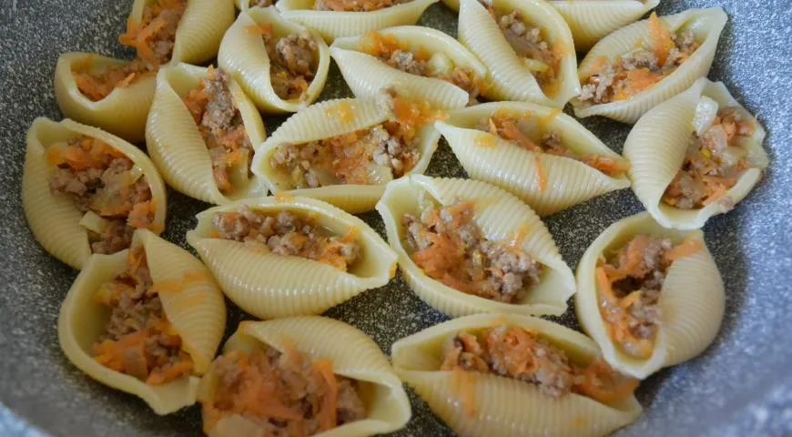 - Выкладка Конкильони: Аккуратно выложите фаршированные ракушки в форму, стараясь разместить их в один слой.