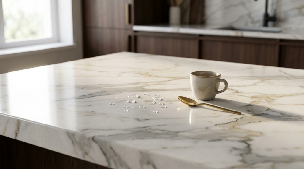 Технический факт: натуральный мрамор и роскошный оникс имеют выраженную пористую структуру. Без правильного защитного барьера они абсорбируют вино, утренний кофе и кулинарные масла невероятно быстро. Жидкость мгновенно проникает вглубь породы, разрушая хрупкий кальцит. Глубокая реставрация на дому стоит очень дорого, оставляет после себя много мелкодисперсной пыли, а главное — безвозвратно снимает полезный слой уникальной породы.