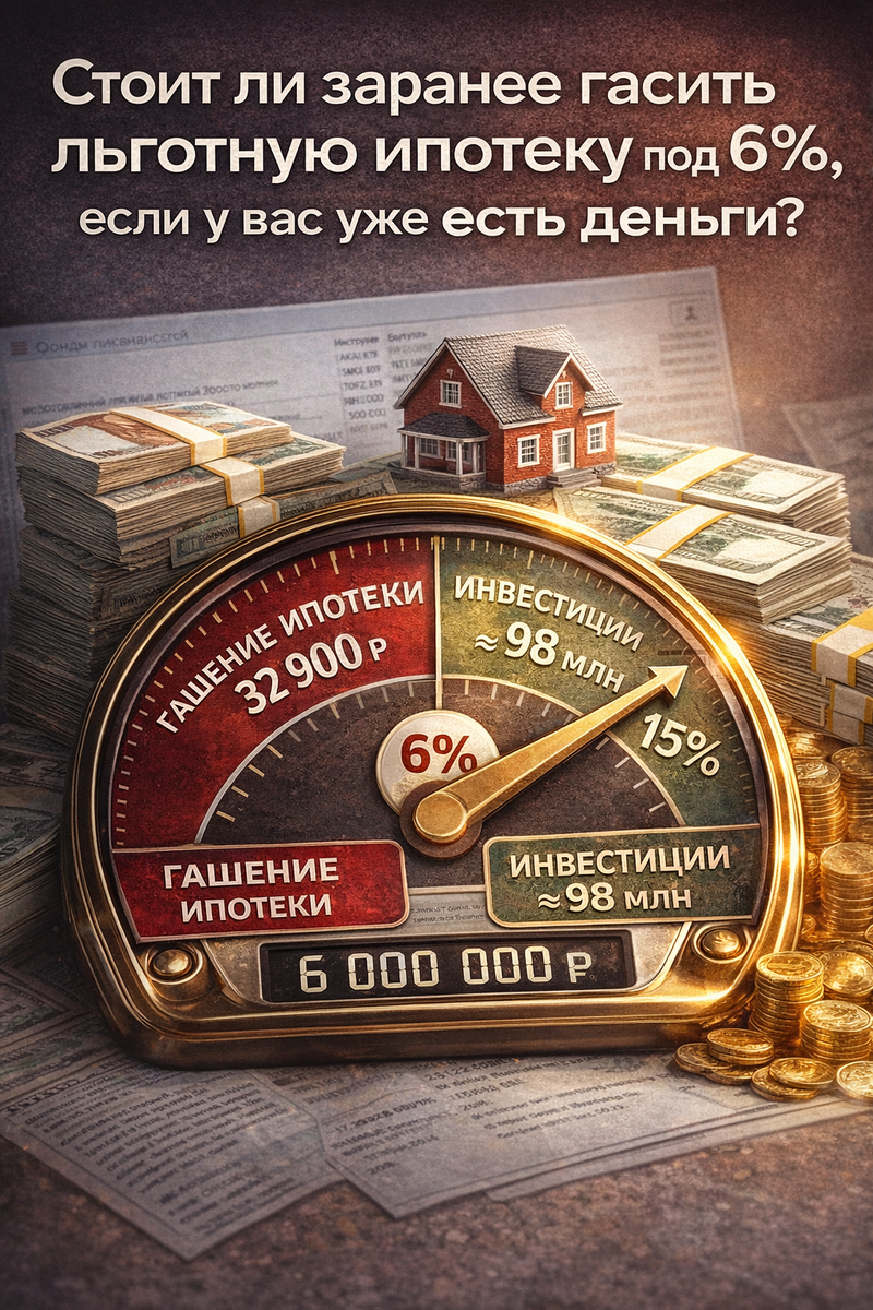 Если у человека есть ипотека или кредит, то его первое естественное желание — как можно быстрее всё закрыть. И это легко понять. Человек видит переплату, понимает, сколько денег уходит банку, и хочет как можно быстрее избавиться от этого обязательства. Не только ради выгоды, но и ради психологического комфорта. В голове всё звучит просто: есть деньги — закрой долг — спи спокойно. Но именно здесь часто и совершается финансовая ошибка. Потому что сейчас на рынке есть возможности, при которых с точки зрения математики выгоднее не закрывать дешёвый долг, а грамотно разместить капитал под более высокую фиксированную доходность. На одной из консультаций как раз разбирали такую ситуацию. И мне пришлось отдельно потратить время, чтобы показать: иногда человек выбирает не более выгодное решение, а просто более приятное психологически. То есть покупает себе ощущение облегчения, хотя деньги в этот момент могли бы работать значительно эффективнее. Разберём пример. Есть льготная ипотека: 6 000 000