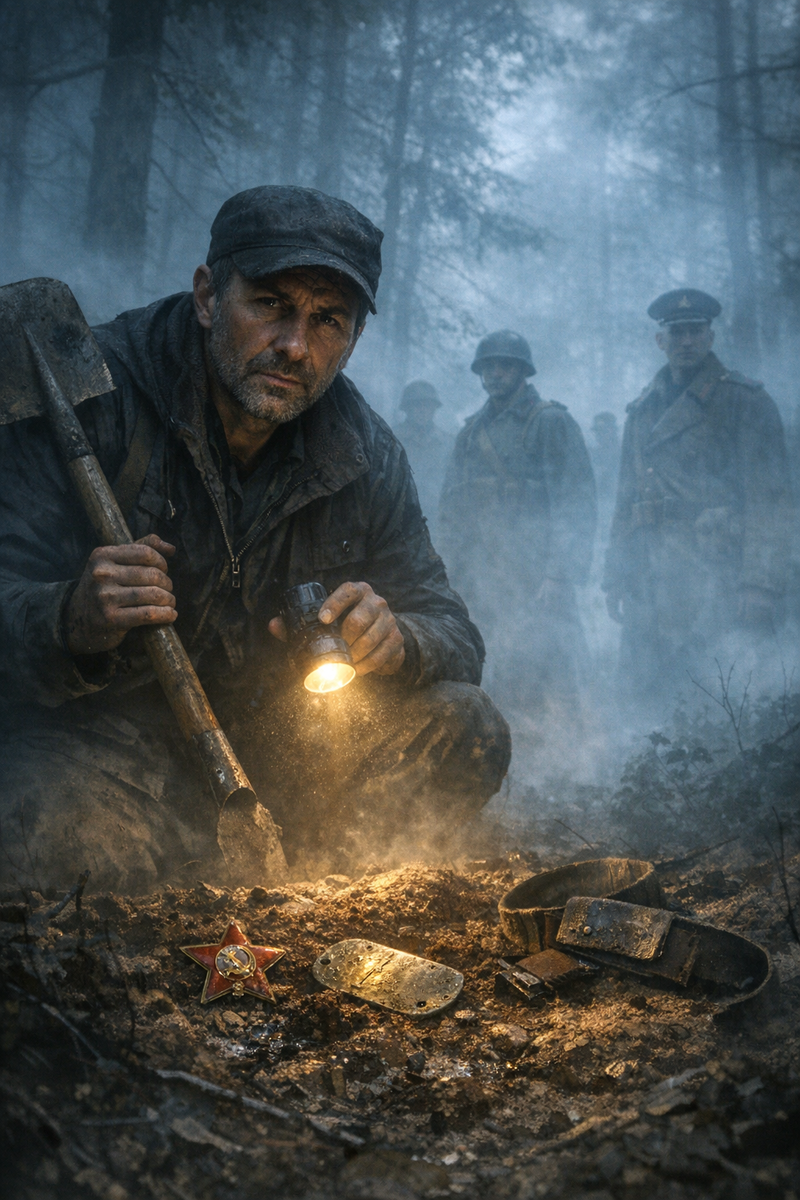 Ночь опустилась быстро, как будто кто‑то резко закрыл книгу. Ветер утих, и лес стал слышать только собственное дыхание. Он шёл по тропе, которую знал лучше, чем свою ладонь: старые выемки, поваленные корни, места, где земля когда‑то была вскрыта. В руках у него был лом и маленький фонарик с тусклым светом. Его звали Иван, но в деревне шептались — чёрный копатель. Он копал не ради денег, а ради памяти, которую не давали покоя сны. Туман поднялся внезапно, как пар из котла. Он был густой и холодный, липкий к лицу, и в нём терялись звуки шагов. Фонарик резал полосу света, но она не доходила далеко: всё вокруг становилось мягким и размытым, как старая фотография. Иван остановился, прислушался. В тумане что‑то шевельнулось, и ему показалось, что это не просто ветер. Он почувствовал, как сердце сжалось — не от страха, а от странного, давнего ожидания. Он нашёл яму там, где земля была уже разрыхлена. Лопата вошла легко, как будто земля сама хотела открыть свою тайну. На глубине блеснул метал