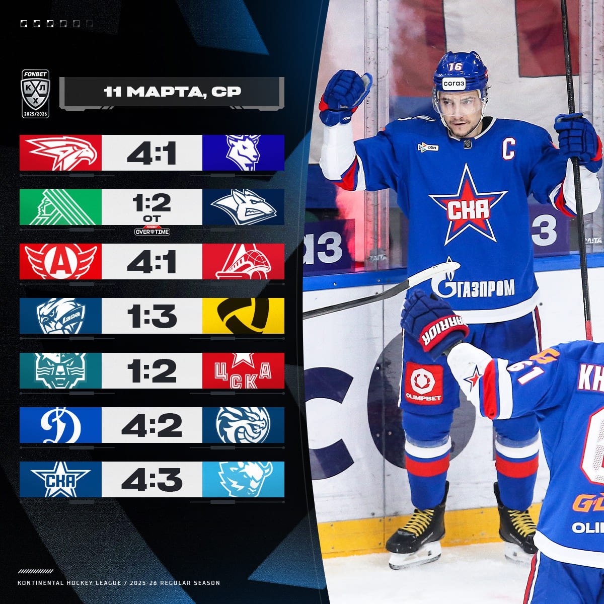 ! Хет-трик Джованни Фьоре принёс «Авангарду» победу над «Торпедо». Дубль Даниэля Спронга помог «Автомобилисту» прервать восьмиматчевую победную серию «Локомотива». Голы Канцерова и Вовченко принесли «Металлургу» два очка в Уфе. «Северсталь» четвёртый раз в сезоне взяла верх над «Ладой». ЦСКА во второй раз за два дня оказался сильнее «Сочи». СКА позволил минскому «Динамо» отыграть три шайбы, но всё же одержал победу в Петербурге. Московское «Динамо» четвёртый раз в сезоне сломило сопротивление «Шанхай Дрэгонс». @russian_rt_sport