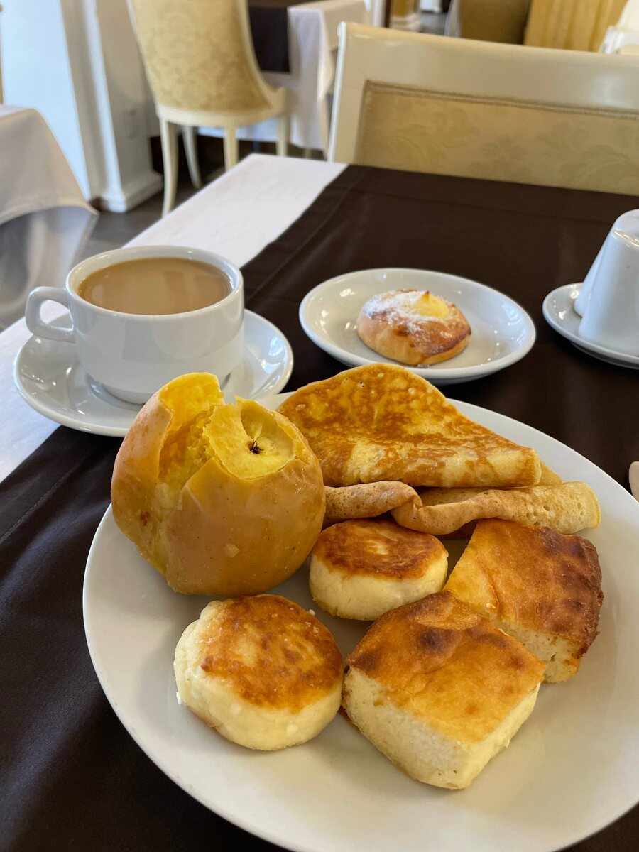 Сегодня: на завтрак по две сырника и творожных запеканок, печенье яблоко, один блин, ватрушка с кофе; перекусила сулугуни; на обед