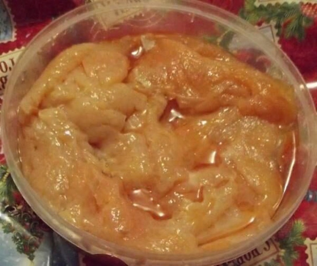 Сначала, разумеется, подождала, пока рыба растает. После разморозки кусочки выглядели, честно говоря, так себе – разного размера, неправильной формы, много брюшек, встречались плавники, куски с жабрами (от головы), много частей хвостов.