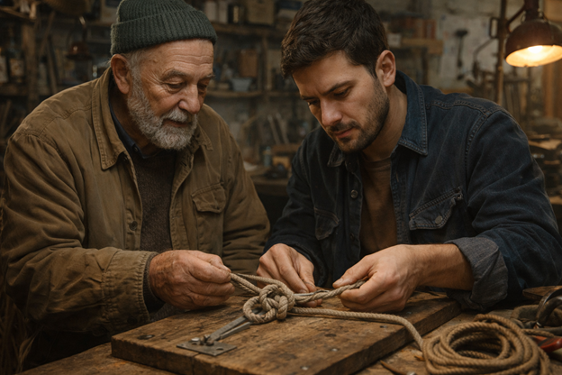 Первое занятие было про инструмент. Илья рассказывал — коротко, по делу, без лишнего. Борис Андреевич слушал и одновременно наблюдал за мастером: как тот держит стамеску, как показывает угол заточки, как объясняет разницу между поперечным и продольным пилением. Профессиональная привычка — он всегда оценивал человека в деле.