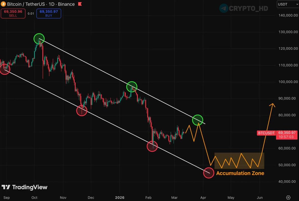 🤔 Популярный график из Twitter – коррекция BTC до $45,000 в апреле-мае, затем рост почти до $90,000 в июне.