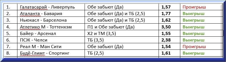 🚫 Галатасарай 1-0 Ливерпуль: Обе забьют (Да) 1,57 ✅ Аталанта 1-6 Бавария: Обе забьют (Да) и ТБ (2,5) 1,77 ✅ Ньюкасл 1-1 Барселона: Обе забьют (Да) и ТБ (2,5) 1,62 ✅ Атлетико М 5-2 Тоттенхэм: П1 и Обе забьют (Да) 3,50 ✅ Байер 1-1 Арсенал: X2 и ТМ (3,5) 1,55 ✅ ПСЖ 5-2 Челси: ТБ (3,5) 2,38 🚫 Реал М 3-0 Ман Сити: Обе забьют (Да) 1,54 ✅ Будё-Глимт 3-0 Спортинг: ТБ (2,5) 1,61 👉 ПОДПИШИСЬ НА BETSSOCCER