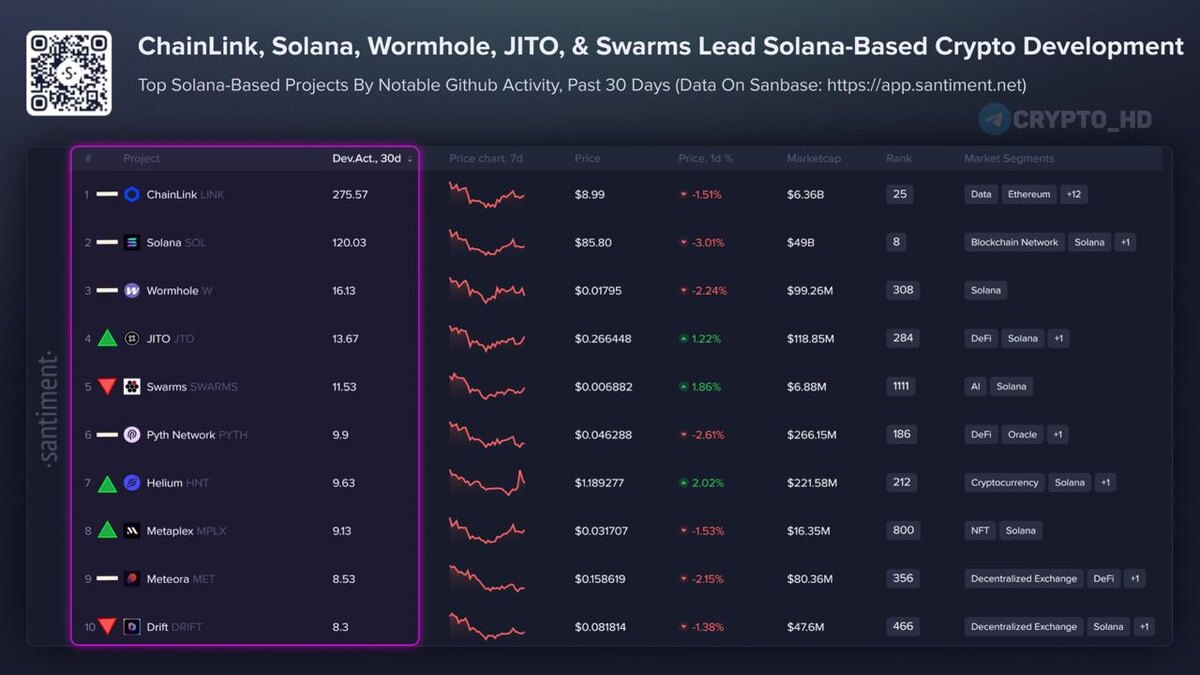📊 Santiment: ТОП-10 криптопроектов экосистемы Solana по активности разработчиков за последние 30 дней. 1. ChainLink #LINK 2. Solana #SOL 3. Wormhole #W 4. JITO #JTO 5. Swarms #SWARMS 6. Pyth Network #PYTH 7. Helium #HNT 8. Metaplex #MPLX 9. Meteora #MET 10. Drift #DRIFT Сryptо Headlines