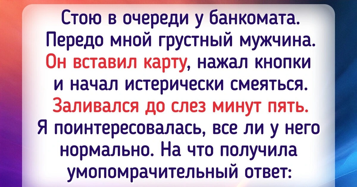 Стою в очереди у банкомата. Передо мной грустный мужчина. Он вставил карту, нажал кнопки и начал истерически смеяться. Заливался до слез минут пять. Я поинтересовалась, все ли у него нормально. На что получила умопомрачительный ответ: «Зарплата такая смешная, что аж до слез». Как же я его понимаю.