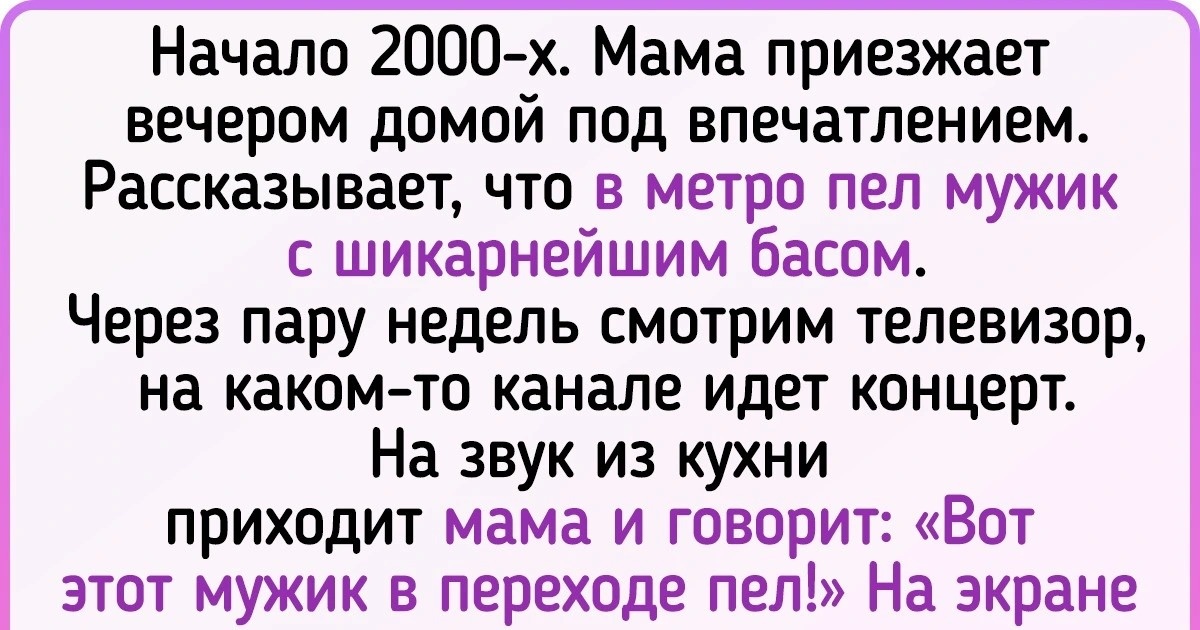 Начало 2000-х. Мама приезжает вечером домой под впечатлением. Рассказывает, что в метро, на выходе с «Комсомольской-кольцевой» на Ярославский вокзал, пел мужик с шикарнейшим басом, второй скакал с кепкой — предлагал проходящим пожертвовать копеечку. Через пару недель смотрим телевизор: на каком-то канале идет концерт. На звук из кухни приходит мама и говорит: «Вот этот мужик в переходе пел!» На экране — Дмитрий Хворостовский. © Леха Мячдырев