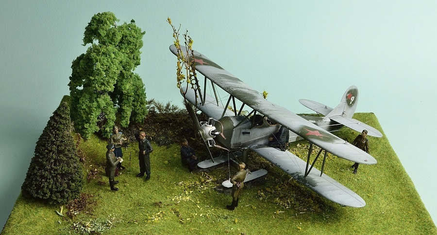 Сыну, в школе (3класс) предложили сделать проект на свободную тему и в свободной форме. Он решил сделать доклад о самолёте По-2. В процессе сбора информации и составления доклада, решили с ним построить и модель "героя" проекта, а потом и миниатюрку с ней. Ну а дальше под моим чутким и мягким руководством работа закипела - собирал и красил самолёт в основном сын(я только наждачкой обрабатывал детали - у него на это терпения ещё не хватает :) ) , "пачкали" совместно, "полянку" тоже делали вместе, фигурки собирал сын, красил больше я. К сожалению, когда покупал модель самолёта не знал, что есть у ICM и летний вариант У-2ВС, ну а потом не нашёл фигурок лётчиков и наземного персонала в зимнем обмундировании. Лепить зимнюю одёжку на летних фигурках ни я ни сын не умеем, поэтому пришлось придумывать историю как объединить зимний самолёт и летних людей.