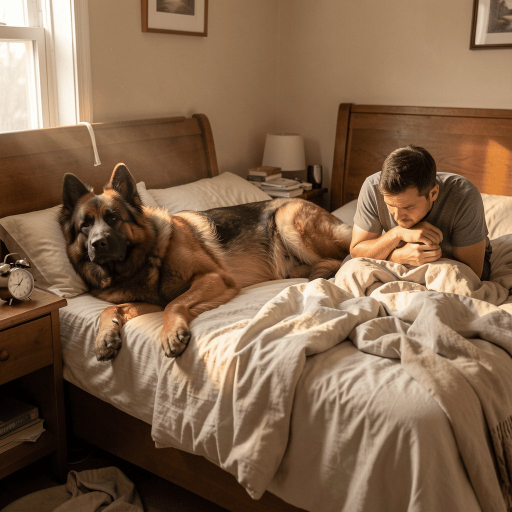 В плохой день он не требует игры. Ложится рядом, голова на колени, тяжёлая и тёплая. Не навязчиво, просто присутствует. Я глажу шерсть. Он вздыхает. Мы молчим. В итоге становится легче.
