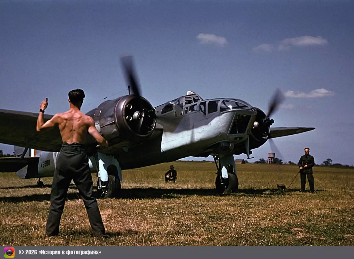 1941 год. Авиатехник подает сигнал пилоту бомбардировщика Бристоль Бленхейм Mk.IV