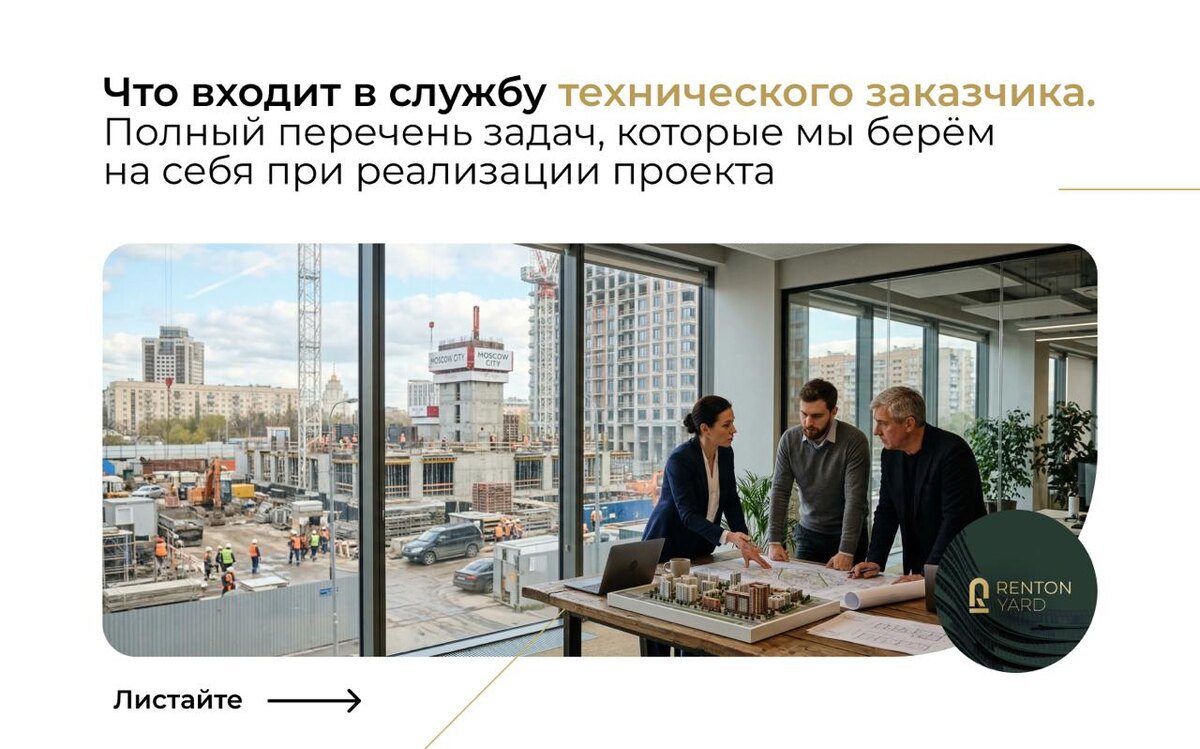 документальной частью. Представим, у вас есть коммерческий участок (кстати, если его нет, можем подобрать из нашего пакета), или объект, который хочется реинвестировать. Может быть, вам уже пришло предписание от города, вы застряли на поиске подрядчиков, или проект вообще пока только на стадии идеи. В любом из этих случаев очень быстро появляется главный вопрос: что делать дальше и кто должен собрать весь процесс воедино. ➡️ Этим как раз и занимается служба технического заказчика. Если простым языком, это команда, которая со стороны собственника или инвестора ведёт проект целиком. Не один отдельный вопрос, а весь процесс сразу. По сути, служба технического заказчика нужна для того, чтобы проект не зависал между юристами, проектировщиками, подрядчиками и городскими процедурами, а двигался вперёд как единая система. Такая служба есть и у нас в Renton Yard. Это одно из наших ключевых направлений. В карточках выше приложили полный перечень задач, которые мы берём на себя в рамках слу