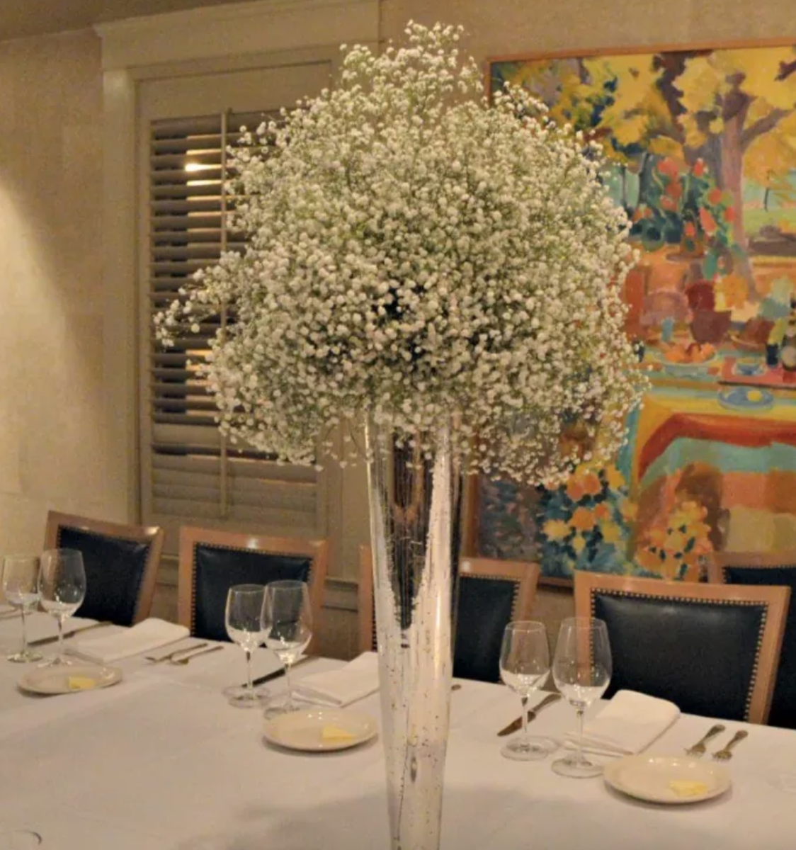 Простые серебристые вазы и гипсофила создают элегантные центральные украшения для стола. Я распаковала их, подрезала каждый стебель и поставила в свежую воду. Я начала с высоких серебристых ваз из ртутного стекла. Пропитала большие шары флористической губки водой и поместила их сверху на вазы. Затем начала втыкать гипсофилу. Продолжала, пока не добилась нужного мне очень пышного вида. Продолжайте, пока зеленая губка не перестанет быть видна. Это простая композиция, с которой легко справится кто угодно. Элегантные композиции из гипсофилы создали атмосферу прекрасного классического ужина.