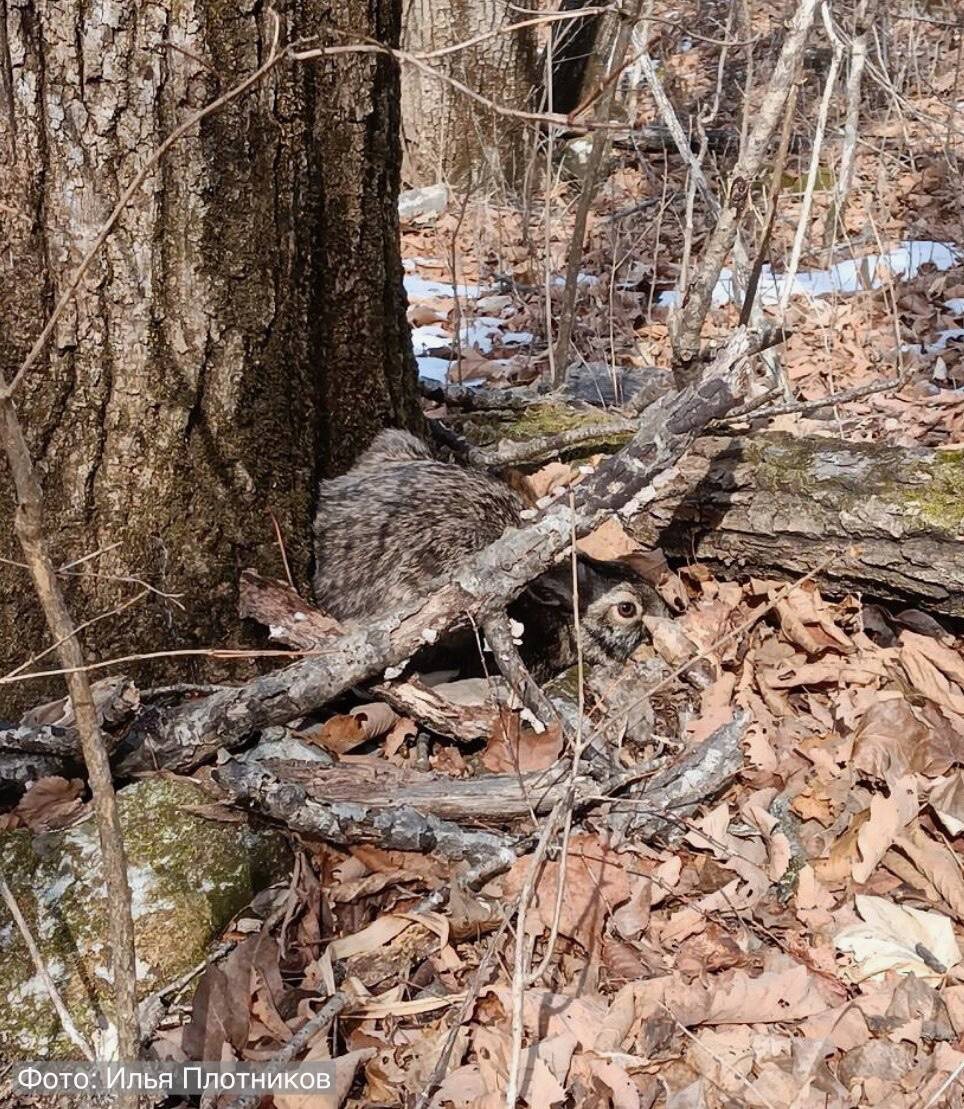 🐇 Нет, перед вами не просто прошлогодняя листва нацпарка, а притаившийся ушастый прыгун. Присмотритесь поближе! Маскировка для маньчжурского зайца — необходимое умение, ведь животное является желанной добычей для многих хищников «Земли леопарда». Днём зайцы обычно устраивают лёжки, поэтому то, что нам удалось увидеть ушастого не в ночное время — большая редкость. 🐆 Здесь «Земля леопарда» / МАХ