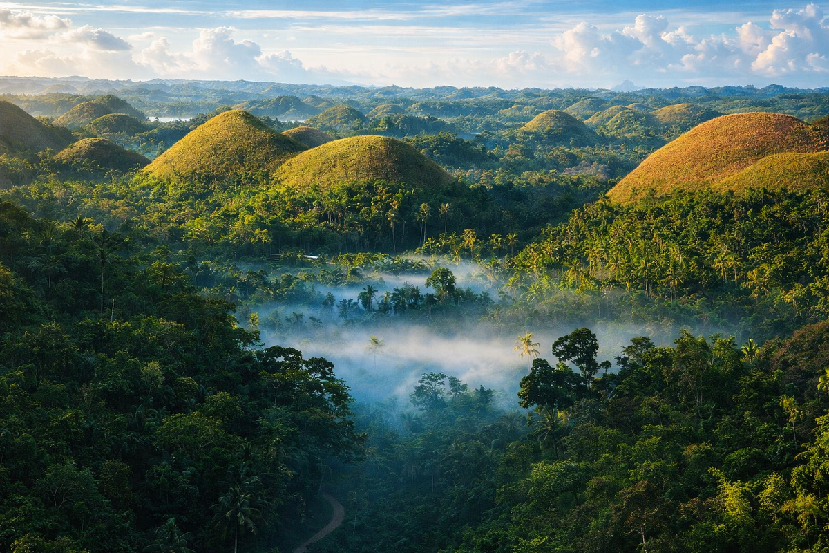 - Шоколадные холмы. Это одна из самых известных достопримечательностей Бохоля. Эти геологические образования выглядят как огромные шоколадные капли, особенно в сухой сезон, когда трава на холмах становится коричневой. Посетители могут подняться на смотровую площадку, чтобы насладиться захватывающим видом.