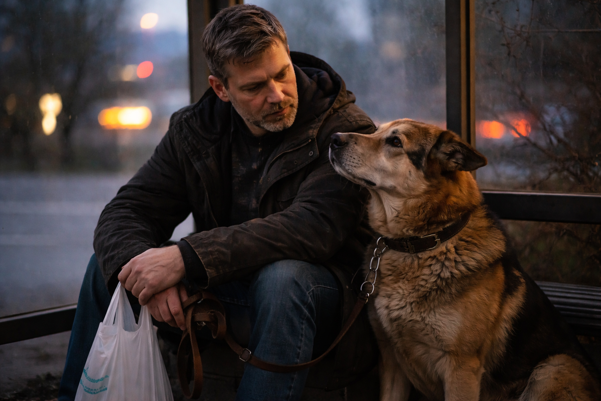 Мужчину с собакой я заметил не сразу. Сначала увидел поводок. Потёртый, кожаный, хороший. Из тех вещей, которые не покупают “по акции”, а носят годами, пока они не становятся мягче руки. Потом уже самого пса. Большой, рыжевато-чёрный, не молодой, но ещё крепкий. Метис овчарки, наверное, или чего-то такого, что в народе называют просто “умная собака”. Он сидел рядом с мужчиной не как питомец, а как человек, который тоже ждёт транспорт, но по каким-то причинам не может держать в лапах проездной.