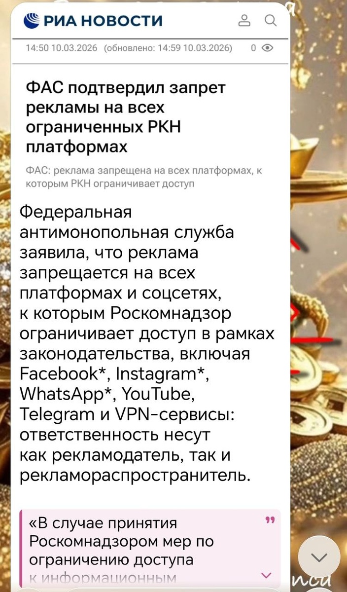#Ваша_Я Честно говоря, не понимаю уже, что имеется в виду под рекламой. И что, собственно, творится-то? Если реклама — это упоминание о ком-то/компании с целью продать товары/услуги, то почему РКН запрещает её в ТГ? Ведь за право размещения, кажется, платить надо. Или эти деньги идут не в казну, а в чей-то частный карман? Если реклама — это любое упоминание о товаре/услуге/производителе этих товаров/услуг, то где тогда можно рекламировать себя? На мамских форумах? В домовых чатах в Максе? На радио и телевидении? Ой, полным-полна моя коробушка... Нагрузиться своим товаром и идти по улицам, громко выкрикивая плюсы приобретения, видимо.