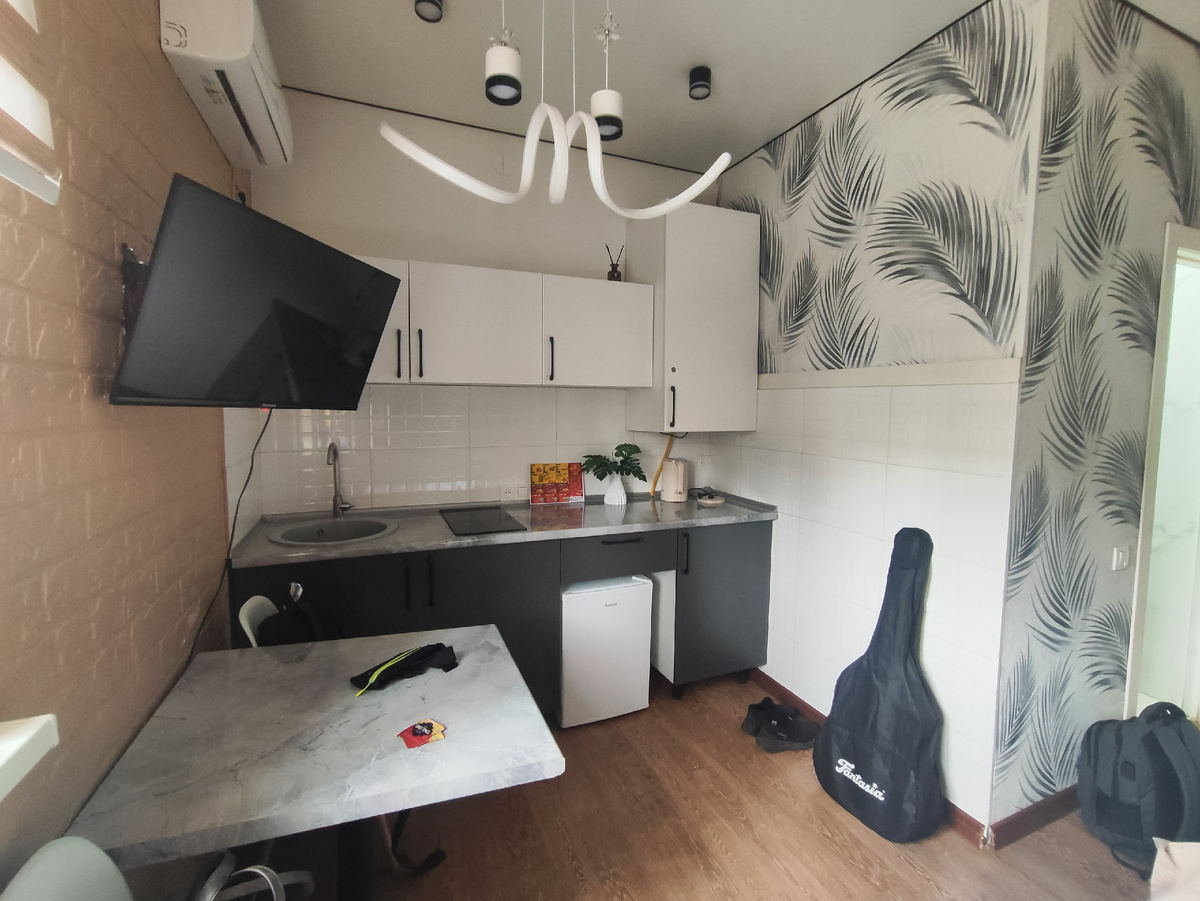 И кровать удобная, и кухонная зона в каждом номере есть с встроенной плитой, чайником и минимальным набором посуды. Санузел с душем, правда, без мыла-шампуня. Белье и полотенца белоснежные, в квартире тихо, соседей мы и не слышали.