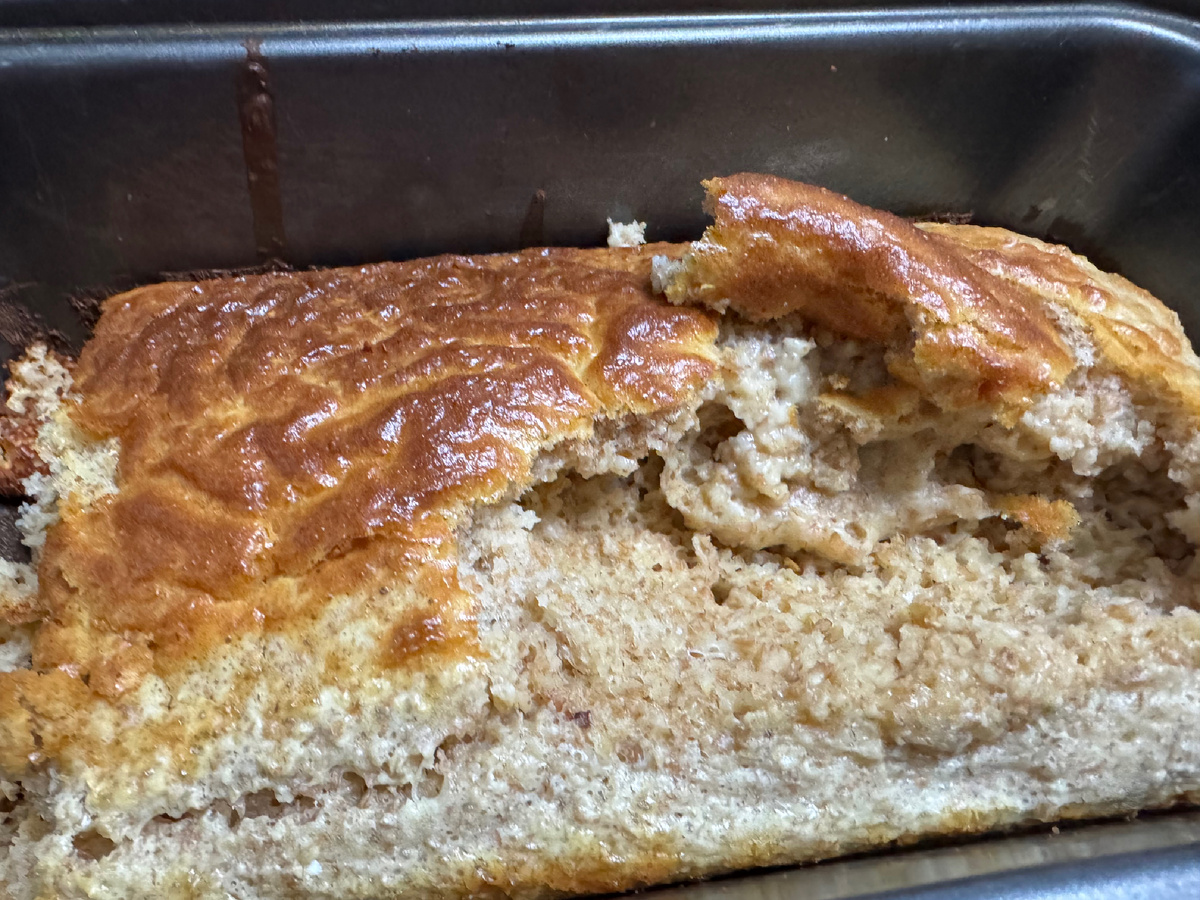 При нарезке и нажиме на горячий хлеб из него стало вылазить недопеченное тесто.