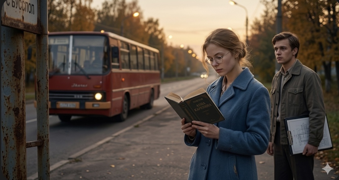 Она стояла на автобусной остановке — в синем пальто, с книгой в руках. Читала стоя, не замечая ничего вокруг.