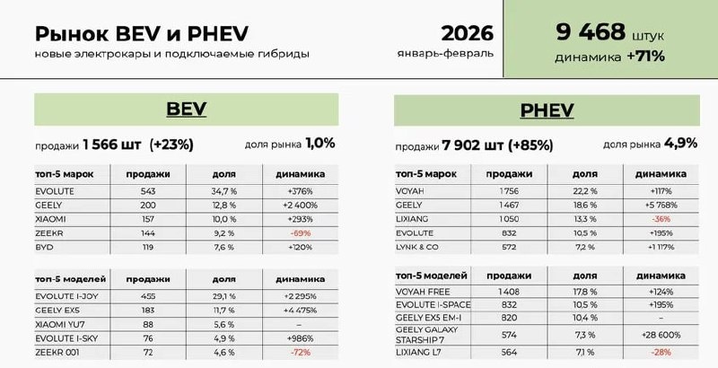 Рынок машин на альтернативном топливе в России продолжает расти. За первые два месяца 2026 года продано почти 9,5 тысяч таких авто (+71% к прошлому году). Однако структура рынка меняется кардинально — об этом рассказал в своём телеграм-канале гендиректор «Автостата» Сергей Целиков. 📊Главные тренды: 1️⃣ Гибриды (PHEV) доминируют. Их покупают в 5 раз чаще, чем чистые электрокары (7902 шт. против 1566 шт.). Рост сегмента — мощные +85%. 2️⃣ Смена лидеров. - В гибридах №1 — Voyah (+117%). - В электрокарах №1 — Evolute (занял треть рынка). - В топ-3 среди «электричек» ворвалась Xiaomi с моделью YU7. 3️⃣ Падение бывших фаворитов. Звезды параллельного импорта теряют позиции: - Продажи Zeekr рухнули на 69% (всего 144 машины). - Lixiang потерял 36% и опустился на 3 место в гибридах.