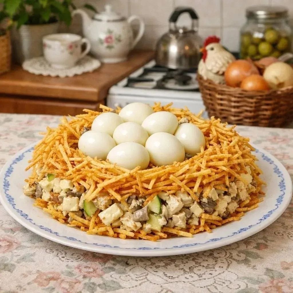 " Нам понадобится: •0,5 кг отварного мяса •0,5 кг сырого картофеля •2-3 огурца •2 луковицы •5 яиц •100 г твердого сыра •200-250 г майонеза •пучок укропа •соль •растительное масло для жарки 🧑🍳Способ приготовления: Отварное мясо режем на тонкие полоски.Лук режем полукольцами и заливаем кипятком на 10 минут, чтобы ушла горечь.Картофель очищаем, натираем на терку для корейской морковки.Жарим картофель 2-3 порциями на растительном масле до золотистого цвета.Огурцы режем тонкими полосками.Яйца варим и отделяем желтки от белком. Белок натираем на крупной терке, а желтки оставляем для формирования яиц, которые будут размещаться в гнезде.Смешиваем мясо, лук, белок, огурцы, жареный картофель, часть которого оставляем для украшения гнезда, с майонезом.Выкладываем салатную массу на тарелку в форме гнезда.Делаем массу для формирования яиц. Для этого твердый сыр и желток натираем на мелкую терку или перепелиные яйца.