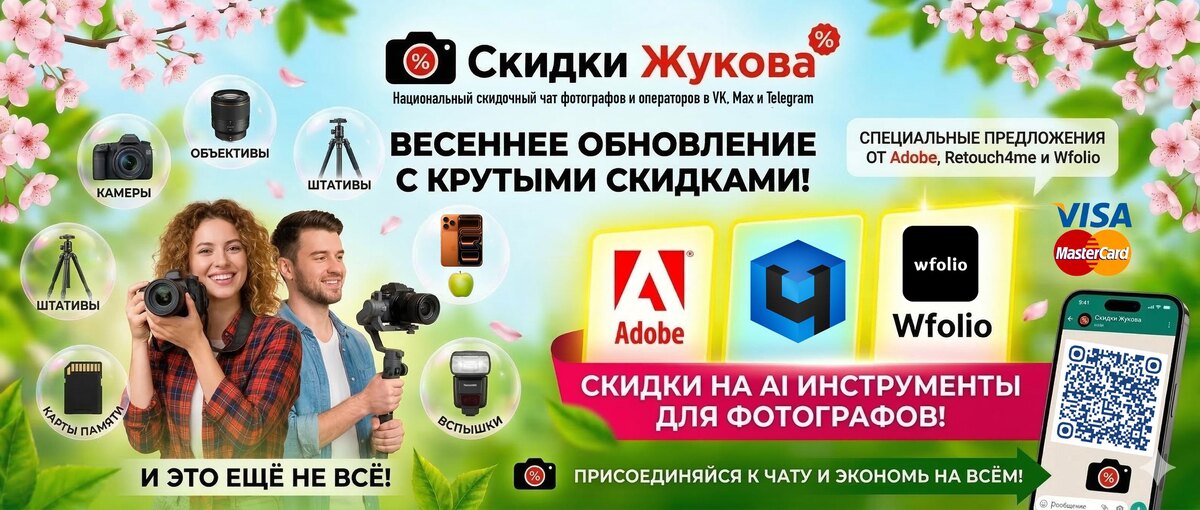 : 🛍 повышенные скидки на Sony, Canon и Nikon (с 12 по 29 марта) Viltrox, Fujifilm, Sigma, Asus и Tamron. А также скидки на всю остальную компьютерную, бытовую, цифровую и фото/видео технику и аксессуары! Пишите в чат в день покупки или за день до "Хочу и название камеры/объектива/аксессуара" ☁️ 50% скидка на сайт для фотографа и оператора за 1й год Wfolio+облачный диск - пишите "Хочу Wfolio" (продления со скидкой нет!) 💳Кредиты при оплате Evoto в подарок по промокоду JZEFLBZL13 (чем больше кредитов покупаете - тем больше вам подарят!) 🎧 Годовая подписка на Spotify от 3200 руб/год для хорошего настроения на съёмках и во время ретуши - пишите "Хочу годовую подписку на Spotify". 🥳 30% скидка на прокат техники в МСК и СПБ в RENTALL - напишите "хочу 30% скидку на прокат фото-видео техники". 🖨 10% скидка в FotoOne в МСК на печать фото и книг - напишите "хочу скидку на печать/проявку пленки/сканирование" 🎨 20% скидка на любые плагины Retouch4me отдельно и вместе, а также на облачные кр