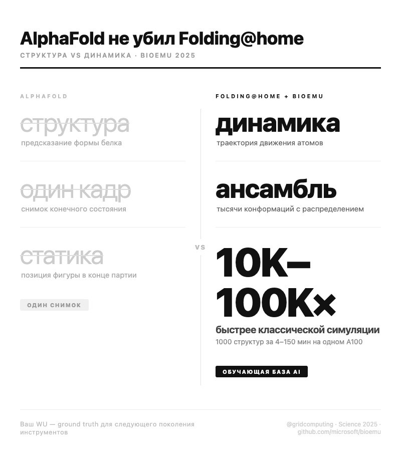 F@h не умер. Он стал обучающей базой следующего поколения. Когда вышел AlphaFold2, все ждали некролога: «Folding@home больше не нужен, белки предсказаны». Но проект живёт — и я понял почему. Знать, где стоит шахматная фигура в конце партии — не значит понять, как она туда пришла. AlphaFold даёт снимок. Один кадр. F@h снимал видео — как белок дрожит, сгибается, открывает скрытые карманы. Эти видео Microsoft взял и обучил на них BioEmu. Модель, которая воспроизводит динамику белка в десятки тысяч раз быстрее классической симуляции. Опубликовано в Science в 2025-м. Поворот, который мне нравится: твой WU (задание) — это не просто кредиты в статистике. Это эталонные данные для AI, который теперь делает за секунды то, на что раньше уходили месяцы суперкомпьютерного времени. Разберём по частям — что именно произошло и почему это меняет смысл кранчинга. Структура vs динамика — в чём разница AlphaFold решил задачу предсказания формы белка по его аминокислотной последовательности. Это была главн
