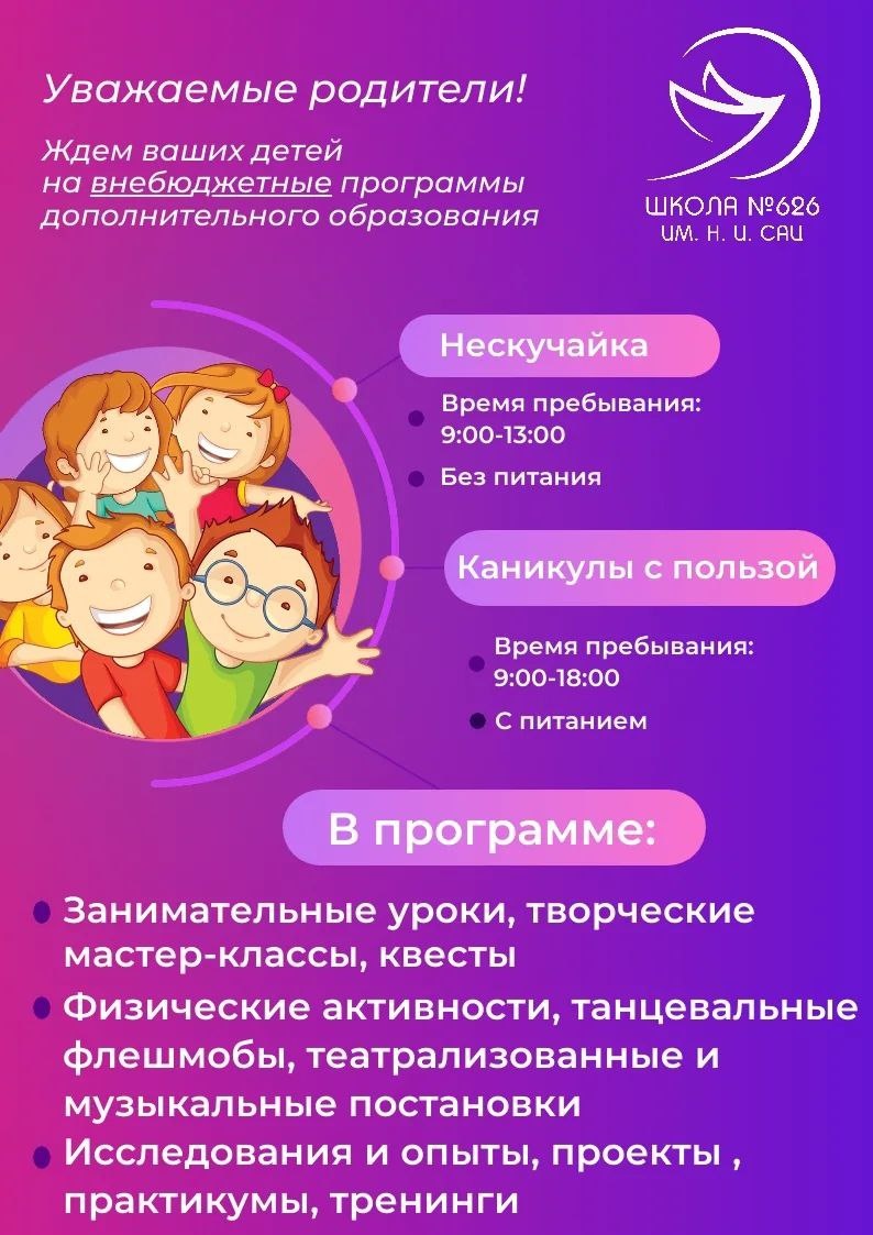 ! Совсем скоро, с 30 марта по 3 апреля 2026 года, начнутся долгожданные весенние каникулы. И мы подготовили для ребят две увлекательные программы, чтобы отдых прошёл весело и с пользой! ✨ Программа «Нескучайка» — это яркий мир творчества, спорта и дружбы. Ребят ждут мастер-классы, игры на свежем воздухе, занятия по духовно-нравственному воспитанию и многое другое. Работаем с понедельника по пятницу с 9:00 до 13:00 (без питания). 🌟 Программа «Каникулы с пользой» — настоящее погружение в мир приключений! Те же интересные направления, но с полноценным питанием и продлённым днём до 18:00. Идеально, если родителям нужно больше свободного времени. 🎨 Мы собрали кружки на любой вкус: от живописи и театра до робототехники и спортивных секций. Скучать точно не придётся — каждый день будет наполнен открытиями и радостью! 📋 Для запуска программ важно ваше желание, дорогие родители. Помогите нам сделать каникулы ваших детей по-настоящему полезными — пройдите короткий опрос по ссылке https:/