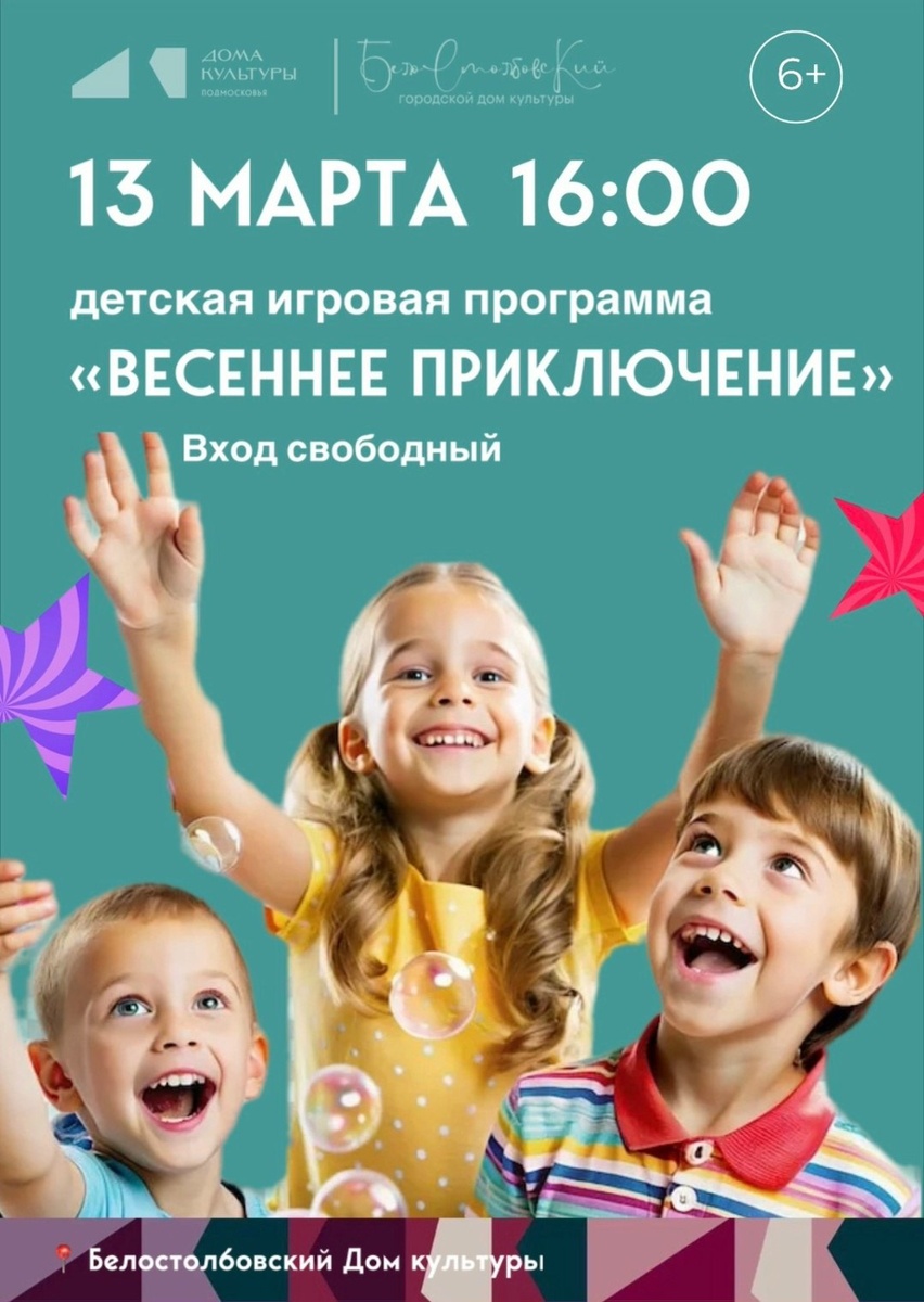 ✨ 🌟 «Весеннее приключение» — игровая программа для детей! 🌟 Приглашаем на весёлый праздник с конкурсами, играми и интерактивными развлечениями. Ведущие подарят детям море позитива и весеннего настроения! Не пропустите — будет ярко и незабываемо! 🎉 🚫 Возраст: 6+ 📆 13.03.2026🕒16:00 🏢 Белостолбовский городской Дом культуры (ГДК) 📍 г.о.Домодедово, мкрн.Белые Cтолбы, ул. Авенариуса стр. 1а 💰 Вход свободный❗️ ✅ Мероприятия Домодедово https://dzen.ru/id/66f10385cc4c5a16f7b5fb02 https://vk.ru/domodedovo_events http://dzen.ru/domodedovo_events
