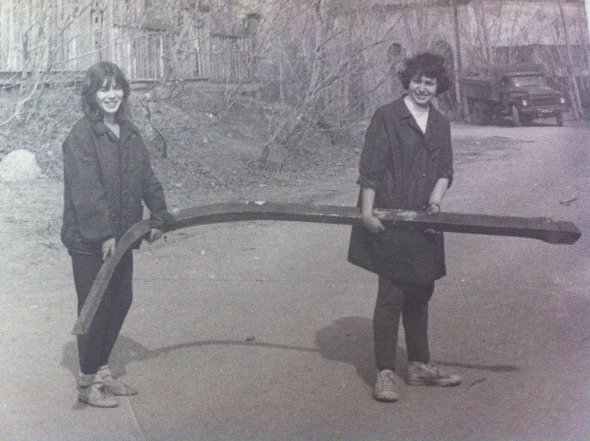 ПУБЛИКУЕТСЯ ВПЕРВЫЕ На фотографии 1972 год. По весне ученики собирали металлолом. Носились по всему району, потому что надо было победить собрать больше, чем у других классов. Как это оценивалось, непонятно. По размеру кучи, что ли? Металл увозили на грузовиках. На таких, как на этом фото. Куда - нам было неизвестно. Были битвы за металл, конечно, между учениками. Наверное, и тырили, что плохо лежало. Таким образом, территория шлюза была очищена. На фото: Галина и Ирина, ученицы 9 класса 121 школы. Фото сделал Александр Андреевич Савилов. Он вообще много фотографировал, печатал фотографии и дарил их. Автор: Галина Эль.