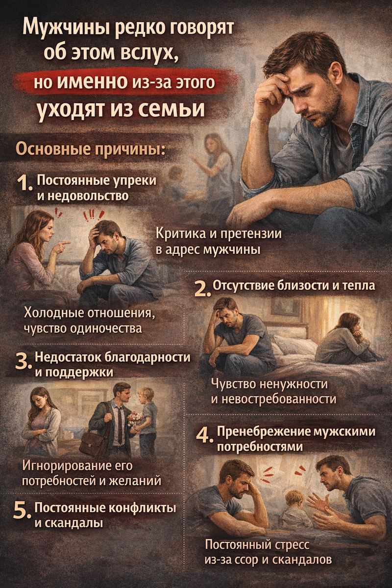 Когда семья распадается, чаще всего ищут очевидные причины: ссоры, измены, финансовые проблемы. Но иногда всё происходит иначе. Со стороны кажется, что всё было относительно спокойно, и вдруг один из партнёров принимает решение уйти. Многие мужчины действительно редко говорят вслух о своих переживаниях. Они могут долго держать всё внутри, не объясняя, что именно их беспокоит. И из-за этого проблемы в отношениях накапливаются постепенно. Со временем появляется дистанция, которая становится всё заметнее. Для многих мужчин важно ощущение, что их мнение имеет значение. Не обязательно соглашаться во всём, но важно чувствовать уважение и внимание к своим словам. Если человек регулярно сталкивается с тем, что его перебивают, игнорируют или воспринимают его слова как нечто незначительное, со временем появляется ощущение, что говорить уже бессмысленно. Тогда мужчина может просто перестать делиться своими мыслями. Иногда в отношениях критика становится привычной формой общения. Это могут быть ме