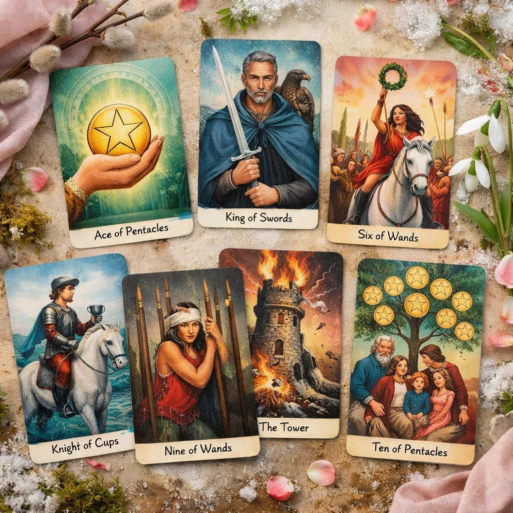 Итак, карты расклада: Туз Пентаклей, Король Мечей, Шестёрка Жезлов, Рыцарь Кубков, Девятка Жезлов, Башня, Десятка Пентаклей.