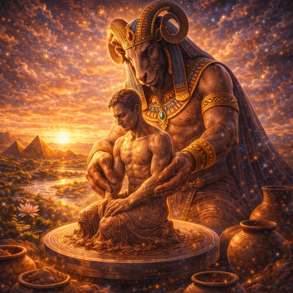 Хнум — не просто бог с головой барана и не просто покровитель гончаров. Он — один из самых телесных, точных и глубоких творцов египетского мира. Он лепит человека из глины Нила, управляет жизненной влагой, связан с истоками реки, покровительствует ремеслу и придаёт форму самому существованию.