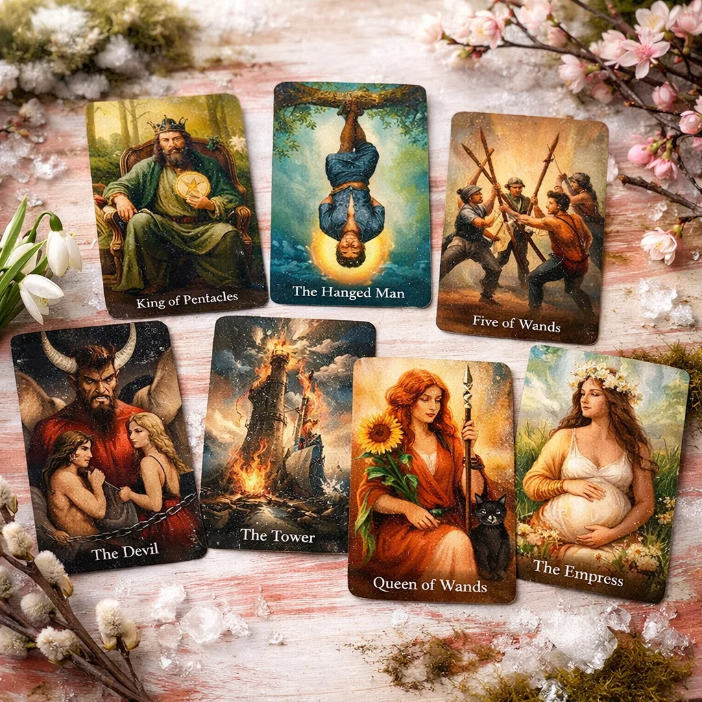 Карты расклада — Король Пентаклей, Повешенный, Пятёрка Жезлов, Королева Жезлов, Дьявол, Башня, Императрица.