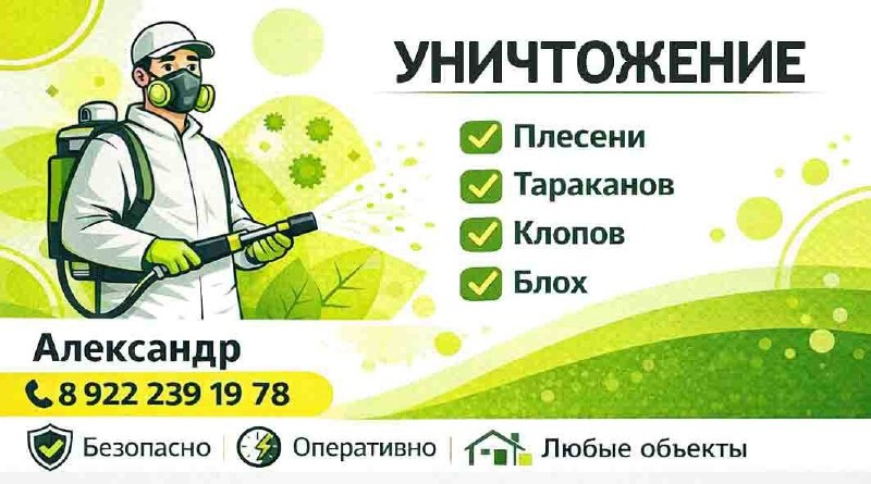 помещению. Александр занимается профессиональной дезинсекцией в Сочи и выезжает на обработку квартир, домов и других помещений. Перед работой проводится консультация и подбирается подходящий способ обработки — в зависимости от ситуации и вида насекомых. Используются сертифицированные средства и профессиональное оборудование: аэрозольные методы, гели и абсорбирующие составы. Задача — устранить проблему максимально эффективно и безопасно для людей и домашних животных. Если столкнулись с такой ситуацией и нужна помощь специалиста, можно связаться напрямую: 📞 +7 922 239 19 78 Иногда одна своевременная обработка позволяет полностью избавиться от проблемы и спокойно жить дальше.