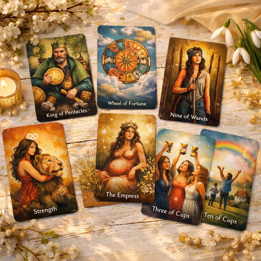 Карты сегодняшнего расклада — Король Пентаклей, Колесо Судьбы, Девятка Жезлов, Тройка Кубков, Императрица, Сила, Десятка Кубков.