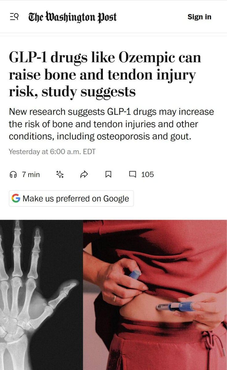 Новое исследование показало, что препараты на основе GLP-1 могут повышать риск проблем с костной системой. Учёные проанализировали данные около 150 тысяч пациентов и выяснили, что за пять лет приёма риск остеопороза увеличивается примерно на 30%, подагры — на 12%, а остеомаляции (размягчения костей) — более чем на 150%. Ранее среди основных побочных эффектов называли в основном проблемы с пищеварением 👉🏻Новости №1 в Ростове 💌Прислать новость/фото Ростов Папа теперь в Ⓜ️🅰️❌