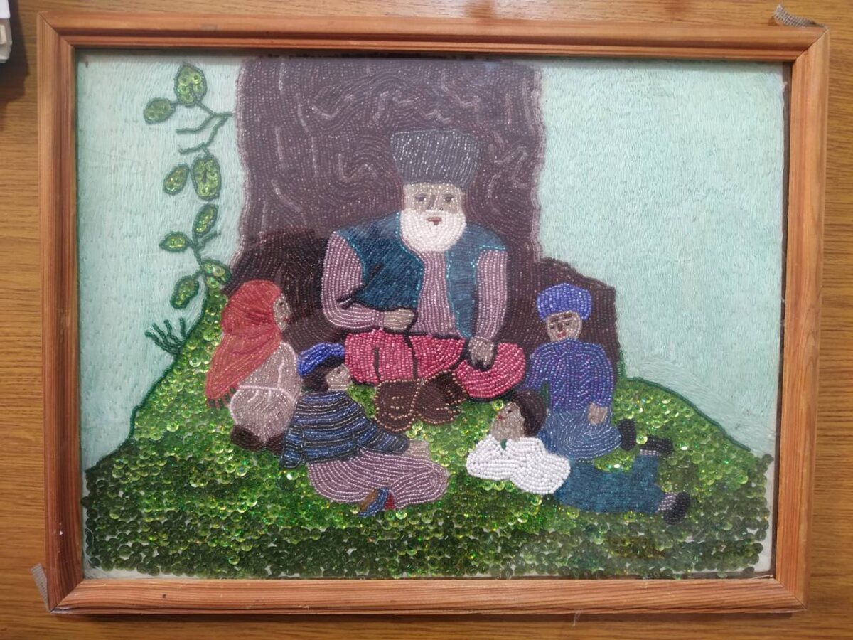В Центре эстетического воспитания детей Рутульского района есть работа, пройти мимо которой невозможно. Не потому что она громкая. Как раз наоборот. Картина из бисера висит на стене тихо и скромно, деревянная рама, стекло, за которым спрятаны тысячи крошечных бусин. Но стоит остановиться и посмотреть, как время замедляется. Что за каждую бусиной, детская рука. За каждым цветом, чьё-то терпение. За каждым предметом, чьё-то усилие. Педагог и дети делали эту работу вместе. На картине - сцене, горцы Дагестана сразу узнают: пожилой мужчина в традиционной форме сидит под большим деревом, а вокруг него дети. Кто-то совсем рядом, кто-то чуть поодаль. Никто не уходит. Дерево за спиной старика темное и мощное, оно не просто фон, оно участник сцены. Корни уходят глубоко. Ветви держатель. Именно это и хотелось сказать авторам. В Рутульском районе - одном из самых труднодоступных уголков Дагестана, где горные сёла века стоят и жизнь меряется не годами, а поколениями, такой образ понятен без слов.
