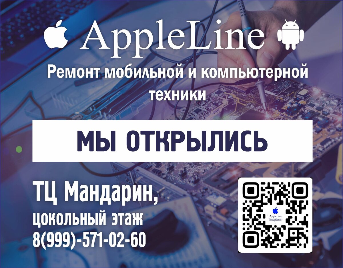 ! Открылся салон по ремонту мобильной и компьютерной техники! 📍ТЦ «Мандарин», цокольный этаж. 🛠️ Решаем любые проблемы с гаджетами! Ремонт, обслуживание, диагностика, восстановление данных, устранение неисправностей аксессуаров. Ждём вас! 📞 Связаться с нами можно: звоните: 8(999)-571-02-60 или пишите в Телеграм. ⏩️в ВКонтакте⏪️ по email: Appleline27@mail.ru Не упустите возможность воспользоваться нашими услугами!