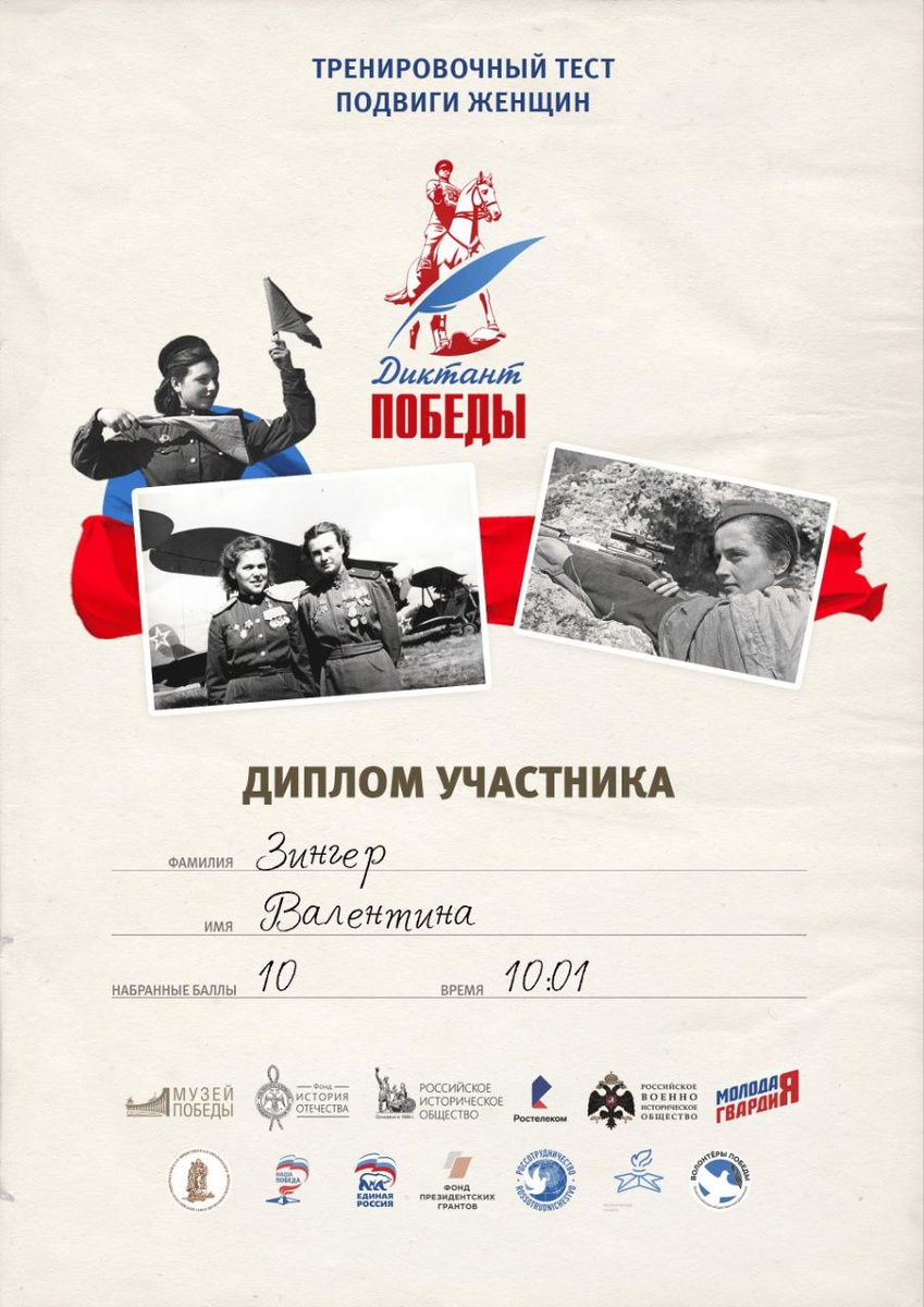 ! ✨ Тест был посвящён подвигам великих женщин в годы Великой Отечественной войны. Каждая задача — это напоминание о невероятной силе, мужестве и самоотверженности наших героинь: лётчиц, медсестёр, партизанок, тружениц тыла… Было непросто, но очень познавательно! Узнала много нового о тех, кто приближал Победу ценой невероятных усилий. 🔔 Очень рекомендую всем пройти этот тест — это не просто проверка знаний, а возможность отдать дань уважения героиням нашей истории и подготовиться к самому «Диктанту Победы»! 👉 Проходите тренировочный тест прямо сейчас: https://диктантпобеды.РФ/test/86