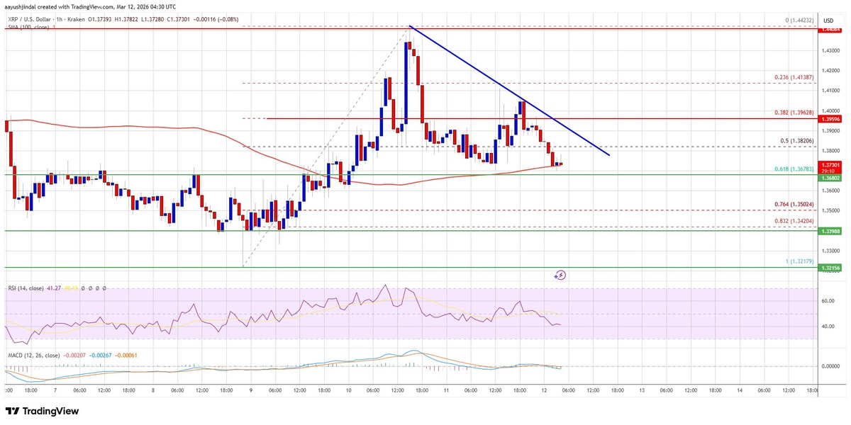 Цена XRP не смогла удержаться выше $1.3950 и начала коррекцию. Сейчас XRP торгуется около $1.3720, на грани дальнейших потерь, несмотря на поддержку на уровне $1.3680. Это снижение последовало за общей коррекцией рынка, включая Bitcoin и Ethereum. 📊 Ключевые моменты: - XRP опустился ниже $1.4050 и $1.4020, войдя в негативную зону. - Пробит уровень 50% коррекции Фибоначчи от движения вверх с $1.3217 до $1.4430. - Сформировалась новая медвежья линия тренда с сопротивлением на $1.3910. - Следующее крупное сопротивление на уровне $1.40. Пробой выше может привести к тесту $1.4140 и далее до $1.4250, а затем $1.450. - Ключевой уровень поддержки находится на $1.3680 (61.8% Фибоначчи). Пробой ниже может вызвать снижение до $1.340, $1.3250 и $1.3050.