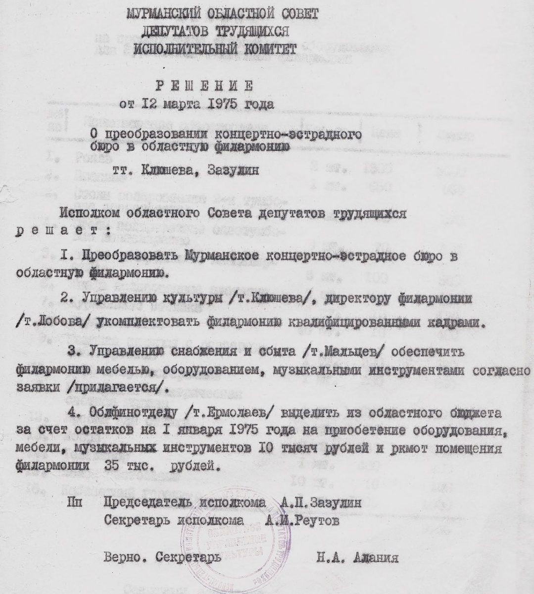 » В 1938 году, с образованием областного отдела по делам искусств, было организовано концертное бюро, которое в 1941 году сменилось концертно-эстрадным. Это учреждение занималось организацией концертов местных и приезжих исполнителей. В том же 1938 году газета «Полярная правда» сообщала о начале работы по «созданию в Мурманске симфонического оркестра, на базе которого будет создана впоследствии музыкальная филармония» . К сожалению, эти планы разрушила начавшаяся в 1941 году война, из-за которой деятельность концертно-эстрадного бюро была приостановлена до 31 мая 1945 года . В период с 1947 по 1971 год мурманское концертно-эстрадное бюро возглавлял Алексей Балакин, кавалер ордена Отечественной войны I степени, заслуженный работник культуры РСФСР. Благодаря его организаторским способностям работа бюро была выведена на совершенно новый уровень. К 1970-м годам для жителей Мурманской области, трудящихся в море и на берегу, ежегодно организовывалось порядка тысячи концертов. К началу 197