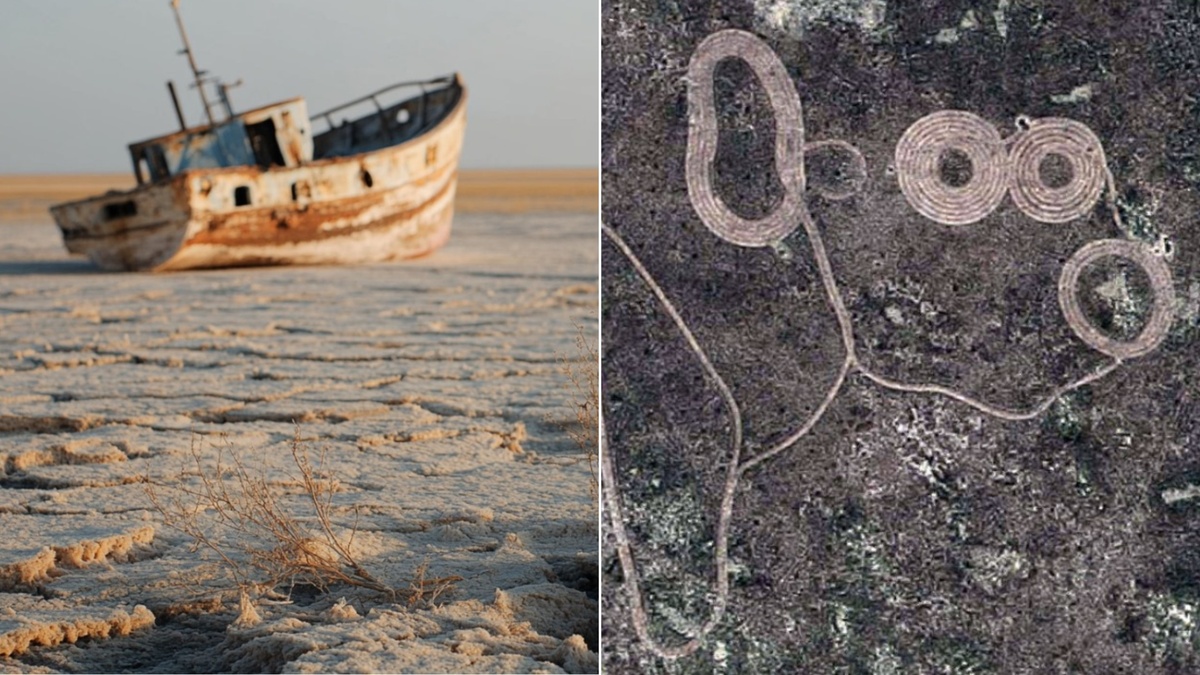 Однако самая удивительная и загадочная находка была сделана не на берегу, а на самом дне. В середине 1990-х годов, когда море обмелело, учёные проводили масштабную аэрофотосъёмку территории. То, что они увидели на снимках, сделанных с большой высоты, потрясло исследователей. На глубине, которая когда-то составляла 15 метров, проступили гигантские фигуры - геоглифы. Впервые их обнаружил исследователь Борис Смердов.