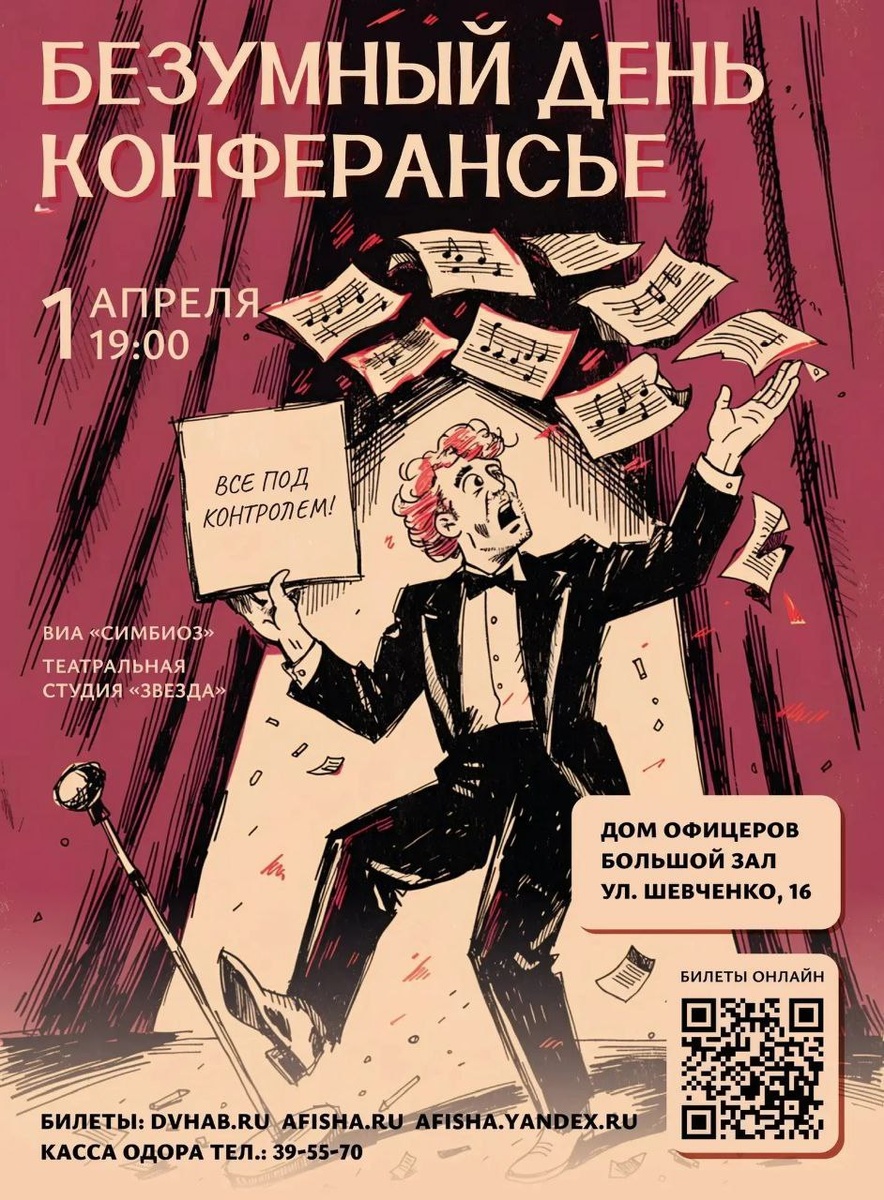 ✔ Юмористический концерт в честь Дня смеха. ✔ В программе музыкальные номера, песни и танцы. ✔ Выступление вокально-инструментального ансамбля «Симбиоз». ✔ Участие театральной студии «Звезда». ✔ Театрализованная история о конферансье, у которого всё идёт не по плану. 📅 Когда: #1_апреля 19:00 ⛳ Где: Дом офицеров Восточного военного округа, ул. Шевченко, 16 💳 Стоимость: от 500 до 1500 ₽ 📞 Контакты: +7 (4212) 395-570 Билеты 👉 Афиша Хабаровска. Куда сходить, экскурсии
