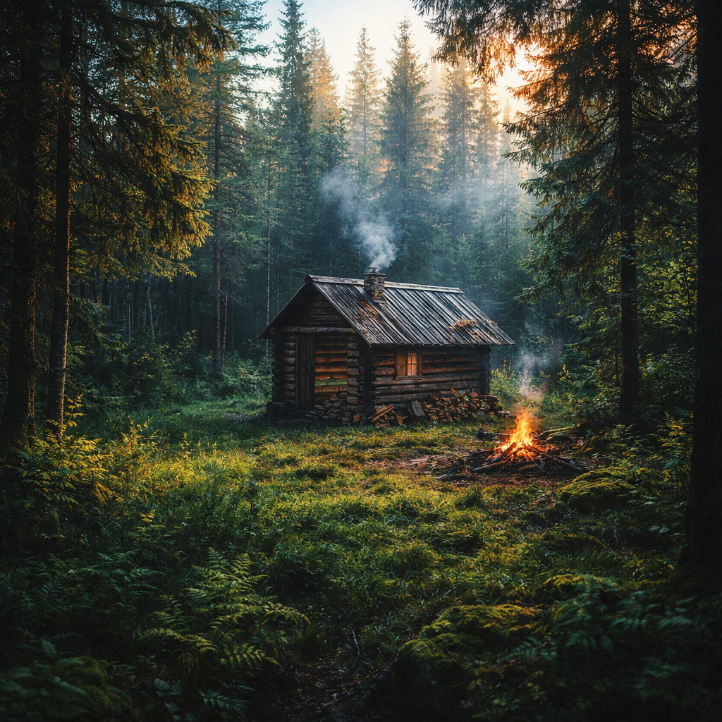 Глушь. Непроходимая, густая, живая. Под ногами хрустит вековой мох, ветви елей сплетаются в темный свод, и лишь редкие солнечные лучи пробиваются сквозь эту естественную крышу, рисуя на земле золотистые пятна. Иди, не зная куда, и внезапно — расступится лес, откроется небольшая поляна, а на ней, будто вырастая из самой земли, стоит Она. Изба. Не дом, не усадьба — именно изба. Бревна, почерневшие от времени и влаги, замшелая кровля, давно утратившая форму, крошечное оконце, в котором отражается теперь лишь пустота. Это не просто заброшенное строение. Это осколок. Осколок целого мира, забытый в зеленом царстве природы, которая медленно, но неумолимо забирает своё. Стоя перед этим строением, невольно задаёшься вопросами, на которые уже некому ответить. Кто он был, человек, решивший поселиться здесь, вдали от дорог и соседей? Лесник, следящий за угодьями? Старовер, искавший уединения для молитв? Или просто вольный человек, бежавший от суеты мира в объятия тишины? Стены избы, сложенные «в л